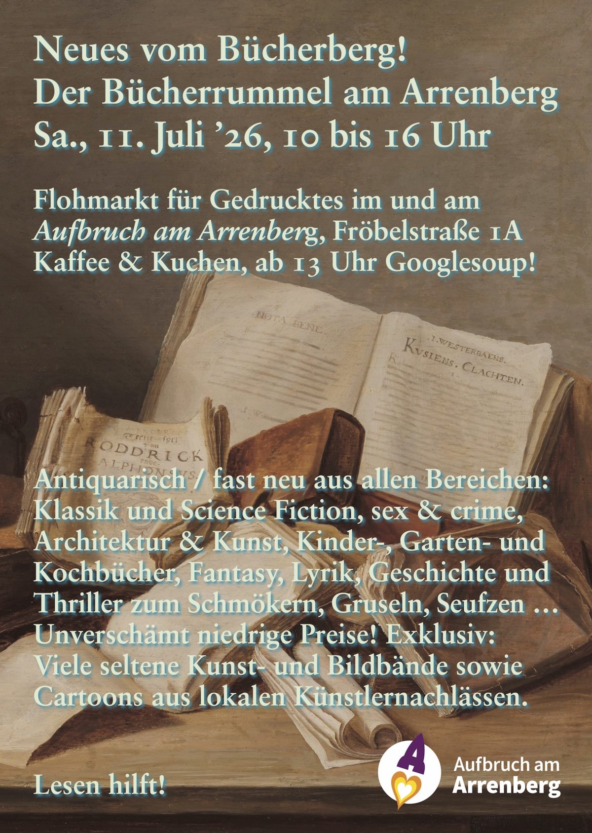 Mit guten Gebrauchtbüchern aus allen Bereichen: Klassik und Science Fiction, sex & crime, Kunst, Architektur, Foto und Design, Kinder-, Garten- und Kochbücher, Lyrik, Geschichte & Thriller zum Schmökern, Gruseln und Seufzen. Freundlichste Preise für jeden Geldbeutel! Exklusiv: viele Cartoon- und Kunstbildbände aus lokalen Künstlernachlässen.