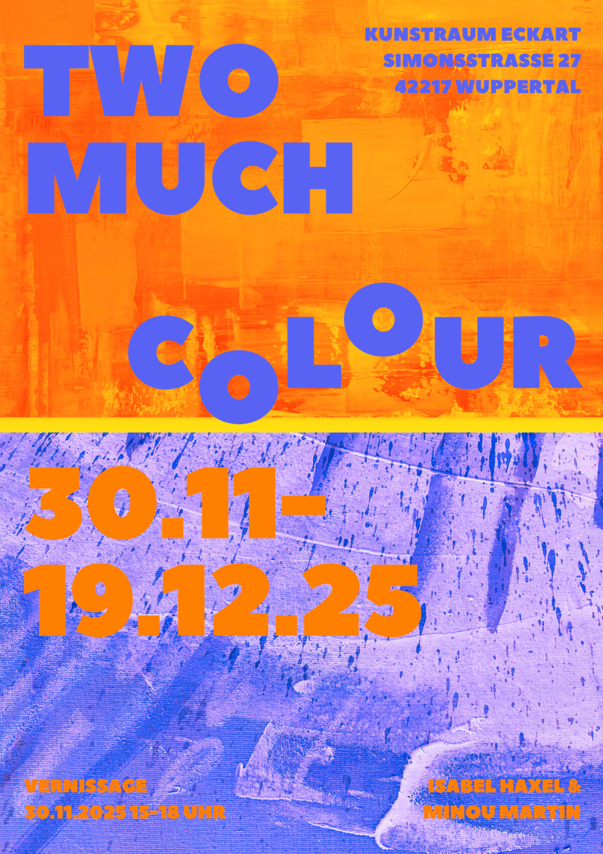 In TWO MUCH COLOUR zeigen Isabel Haxel und Minou Martin abstrakte, farbstarke Arbeiten, die Mut zur Emotion und Freude am „Zuviel“ feiern. Farbe wird hier Haltung, ein Gegenentwurf zum Grau, ein Statement für Sichtbarkeit, Lebendigkeit und Präsenz.